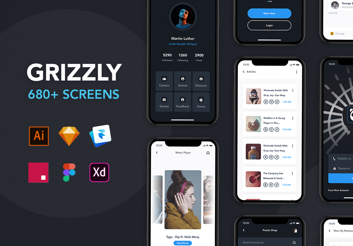 Grizzly | Mobile App Ui KIt for Sketch, Illustrator, XD, Studio, Framer and Figma