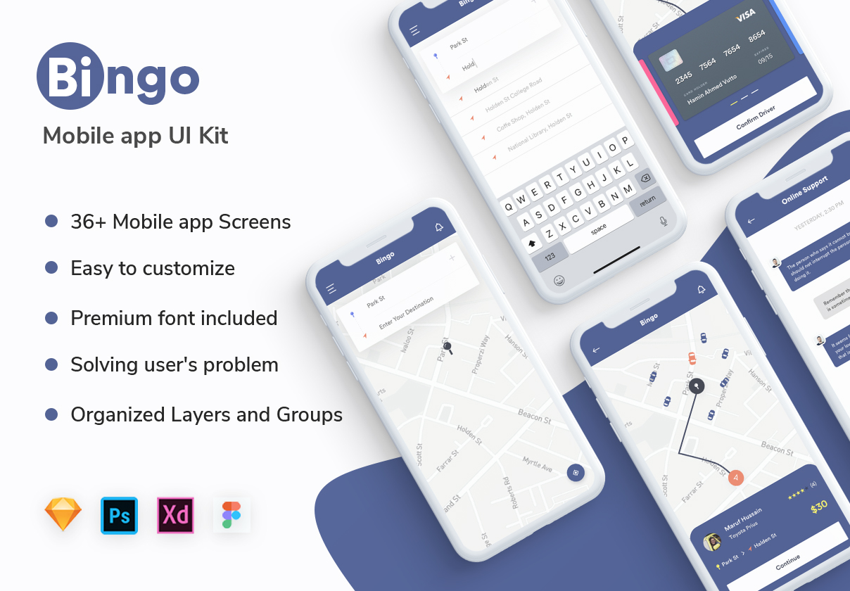 Taxi booking and ride sharing UI Kit for Sketch, Photoshop, XD & Figma.