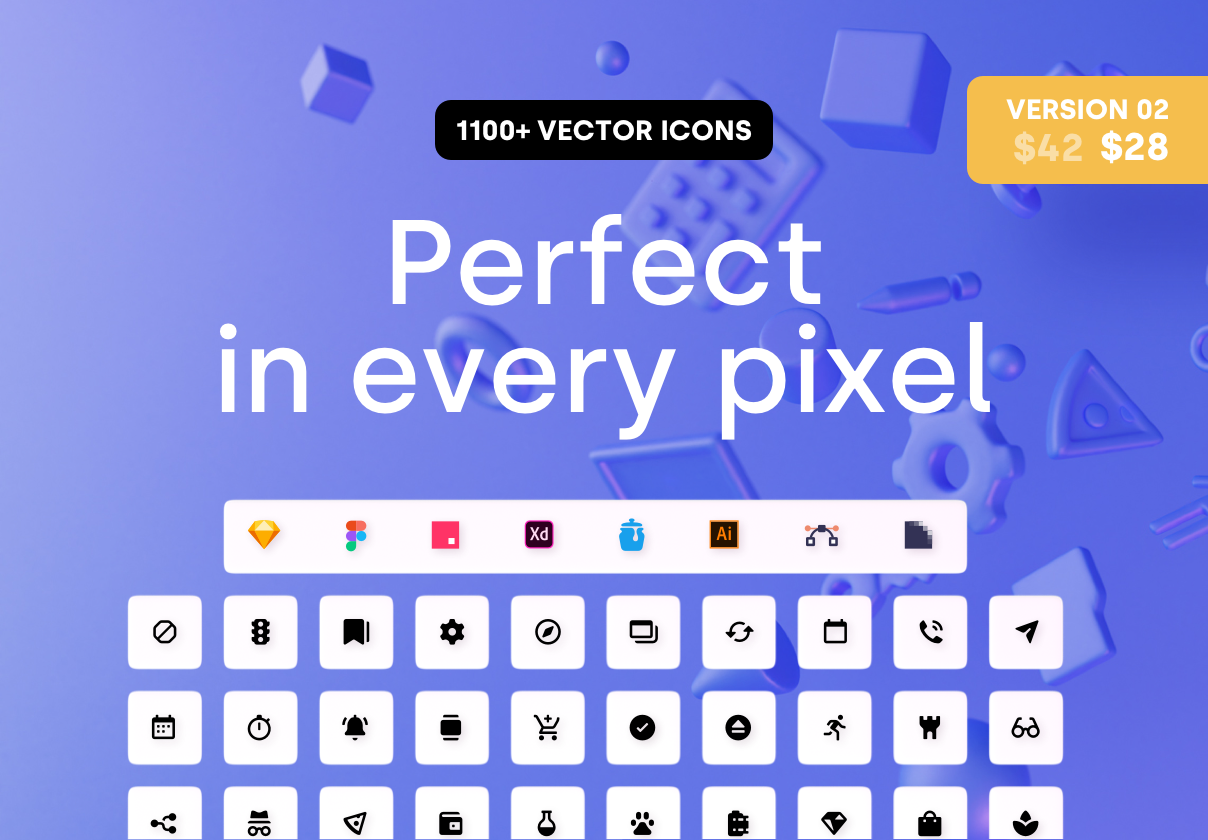 1100+ pixel perfect icons, 23 categories, 10 most popular formats, ligatures supported